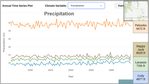 The two dogs begin planning ahead and decide they need to use some data to figure out where a winter meetup might actually work. They turn to the WY-Adapt Climate Comparison Tool to compare two possible skijoring locations near their homes: Pahaska near Cody, and Happy Jack near Laramie.