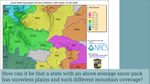 They then consider a current statewide snowpack data snapshot (from the Water Resources Data System) that shows above-average snow conditions across much of Wyoming. At first glance, the numbers look promising, but when they look closer, especially at southeastern Wyoming, they notice places with very low snow-water equivalent of 2% of the 1991-2020 median. How can there be above average in some places, and 2% in others? With such different experiences across the state, they wonder what winter might be like in different parts of the state in the future.
