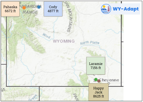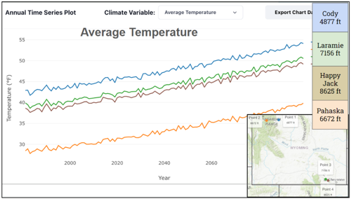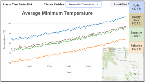 Looking more closely at the data, the dogs explore average minimum temperatures projected into the future, thinking that colder weather probably means snow will “stick” and accumulate better. The model projections clearly show Pahaska is the coldest location, even though nearby Cody appears warmer than Laramie. This raises new questions, especially when Happy Jack, despite its higher elevation, appears slightly warmer than Laramie in the future projections.